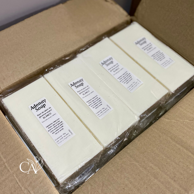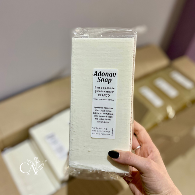 Barra de jabón blanco marca Adonay Soap o Spa, según stock. Sin agregados de aceites o mantecas. Cont. neto: 1 kilo