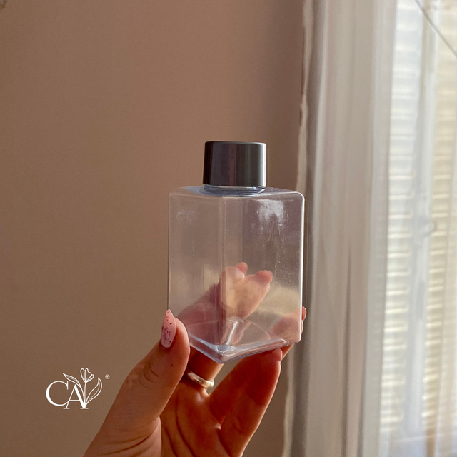 Envase de 125 cc con válvula transparente para home spray/perfumes de hogar. Medidas: 11.8 cm x 5 cm x 5 cm